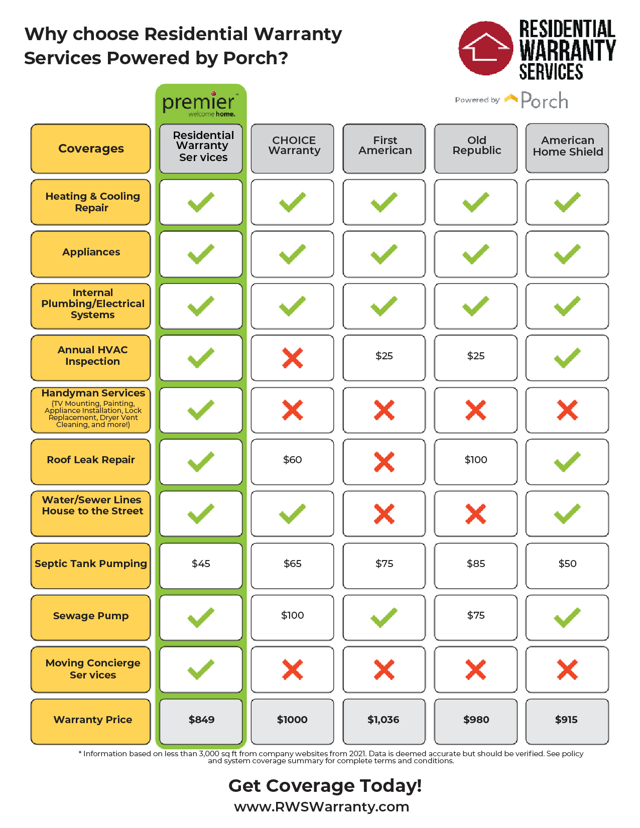 Unlike traditional home insurance, our home warranty is specifically designed to cover the natural wear and tear that occurs with regular usage. From malfunctioning appliances to system failures, our warranty provides the necessary protection to save you from unexpected expenses. With the Porch Whole Home Warranty, you’ll have peace of mind knowing that your covered items are safeguarded.